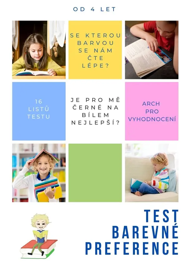 Součástí testu je arch pro záznam výsledků a vyhodnocení. Zjištěná barevná preference vás směruje při výběru barevné fólie při čtení a odpoví na základní otázku. JE PRO MĚ ČERNÁ NA BÍLÉM NEJLEPŠÍ? Balení obsahuje materiály pro otestování 4 osob. Určí v jaké části barevného spektra se nachází vhodná barva pro čtení. Testovaný plní 4 úkoly na 16 listech. Vyhodnocuje se rychlost zpracování a přesnost. Tištěný test test není součástí webináře. Zakoupíte jej na e-schopu www.proskolaky.eu po kliknutí na tlačítko.